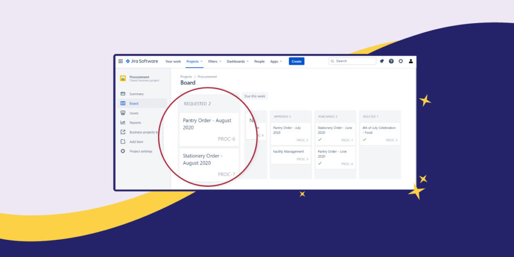 Different project types run across different processes. So make sure to customize the workflows (i.e. issue statuses) to accommodate your project needs. For example, if you’ve selected the procurement project type, you’ll have a procurement workflow reflected on the project board as follows: